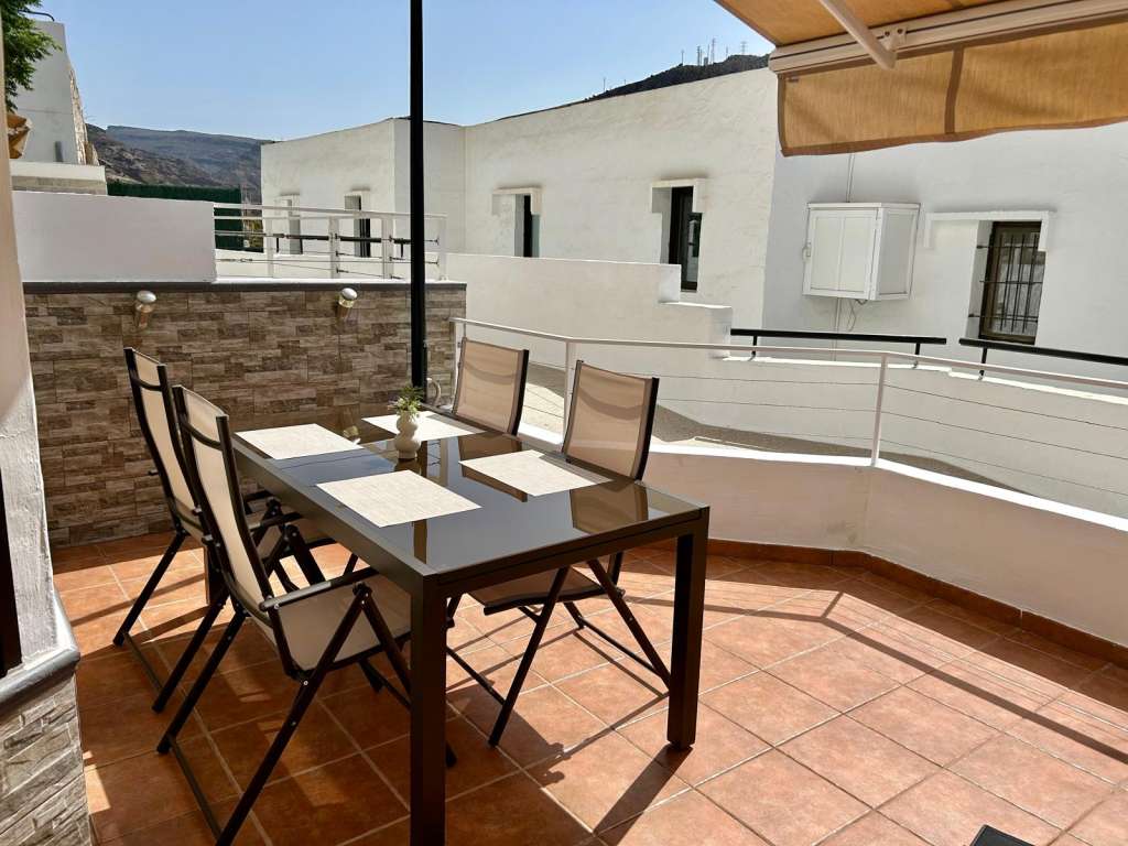 Slunečná terasa je ideálním místem pro relaxaci a venkovní stolování. Je vybavena velkou markýzou, která poskytuje příjemný stín, a prostorným stolem se židlemi, ideálním pro rodinné večeře nebo snídaně pod širým nebem. Pro dokonalý odpočinek jsou k dispozici také dvě pohodlná lehátka, kde si můžete užívat sluneční paprsky nebo číst knihu. Terasa má přímý vchod do apartmánu, což usnadňuje pohyb mezi venkovním a vnitřním prostorem, a vytváří tak příjemné prostředí pro pohodový pobyt.